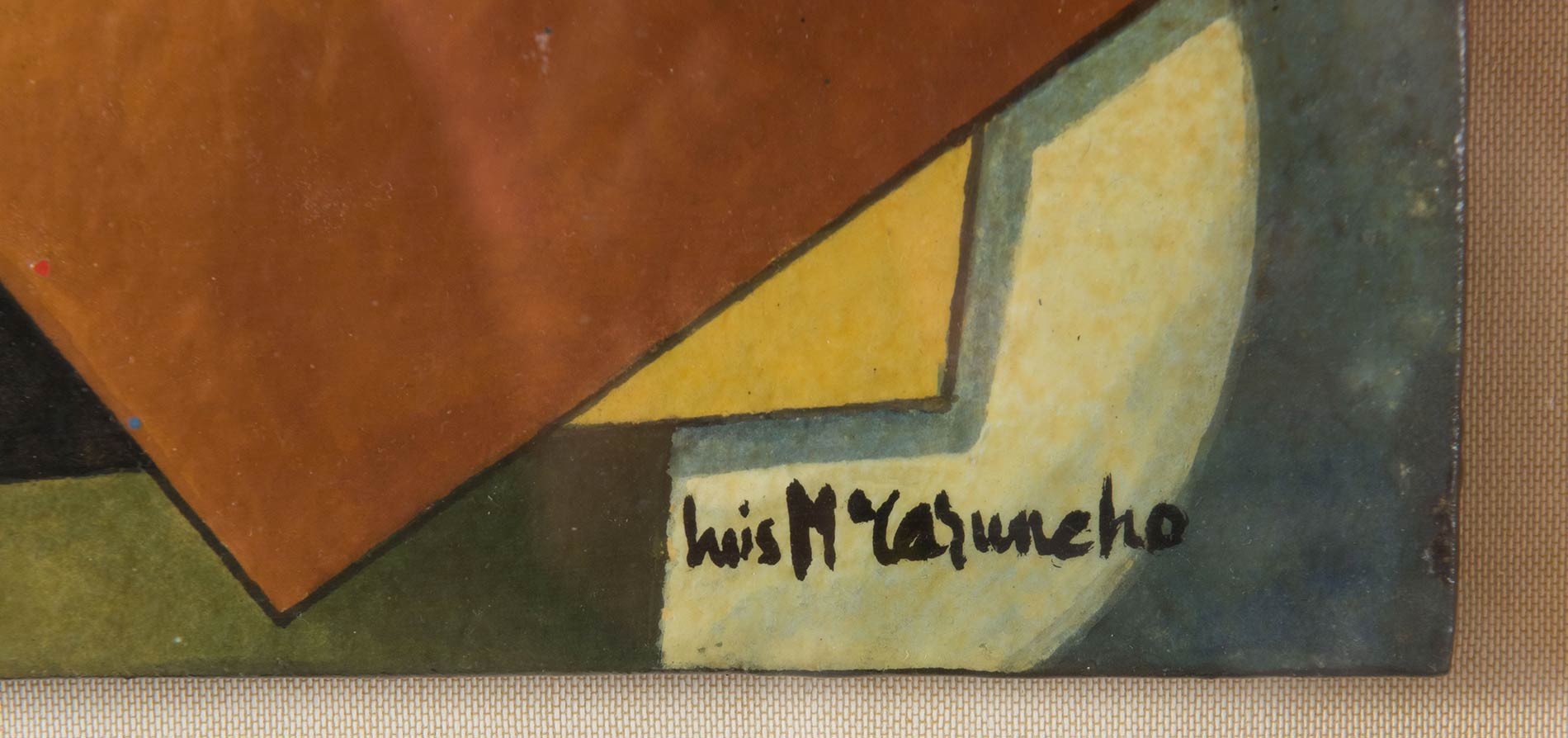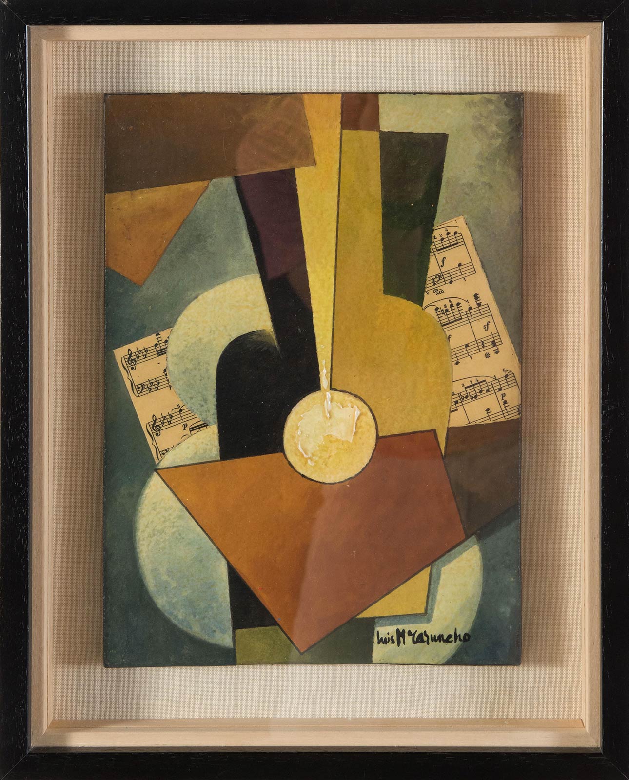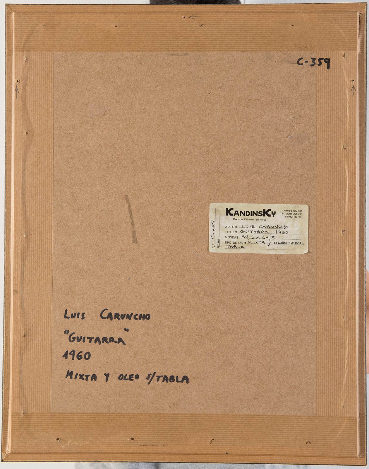 Tecnica mista e olio su tavola, firmato in basso a destra Luis M Caruncho, al retro reca iscrizione ‘Luis Caruncho/’Guitarra’/1960/Mixta y oleo s/tabla’, H cm 34.5x24.5