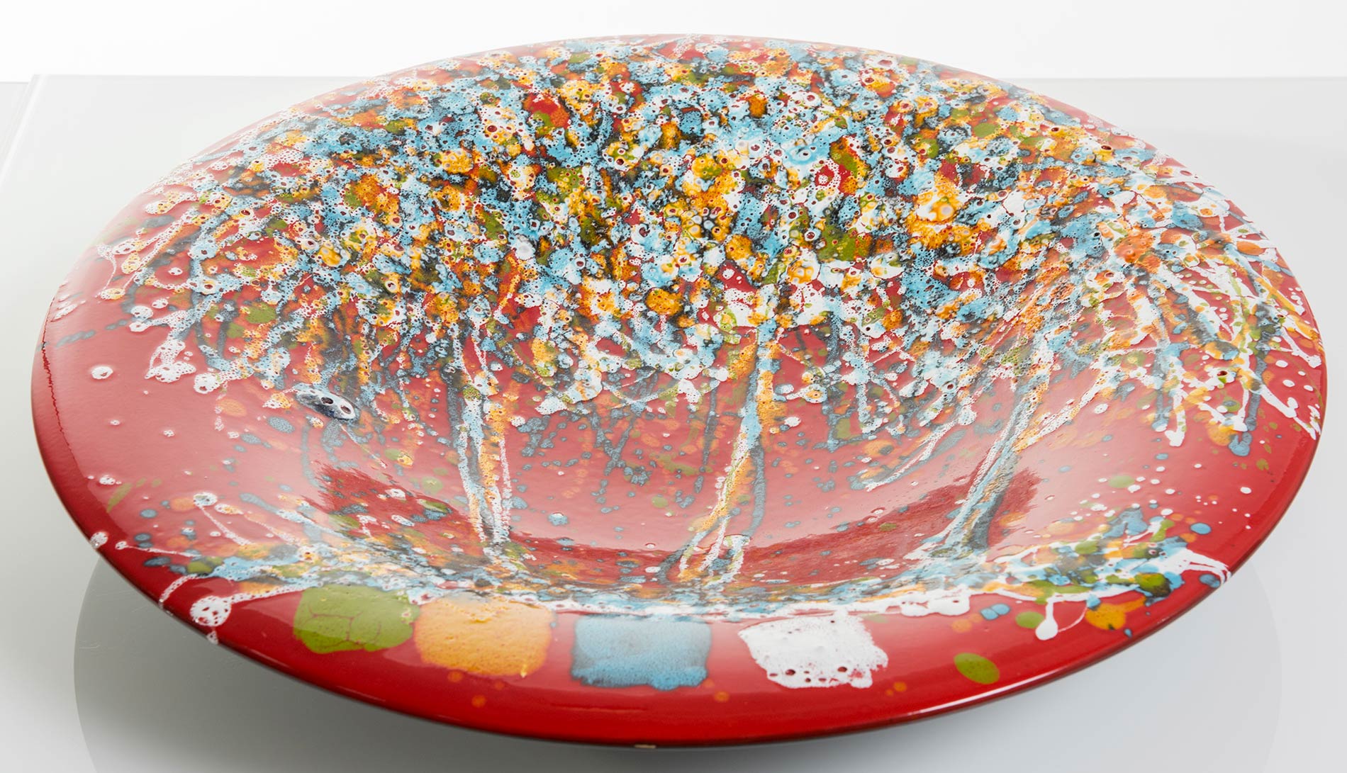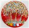 Piatto in ceramica dipinta in policromia, firmato, datato e titolato al retro ‘D’Orsi/92/Alberi/Estivi’, diametro cm 50