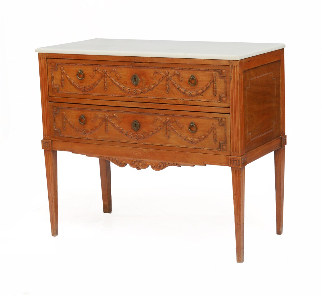 Antico comoncino in legno di frutto a due cassetti intagliati a nastri e festoni, montanti e gambe scanalati, piano in marmo bianco (cm 100x86x47) (difetti e restauri)