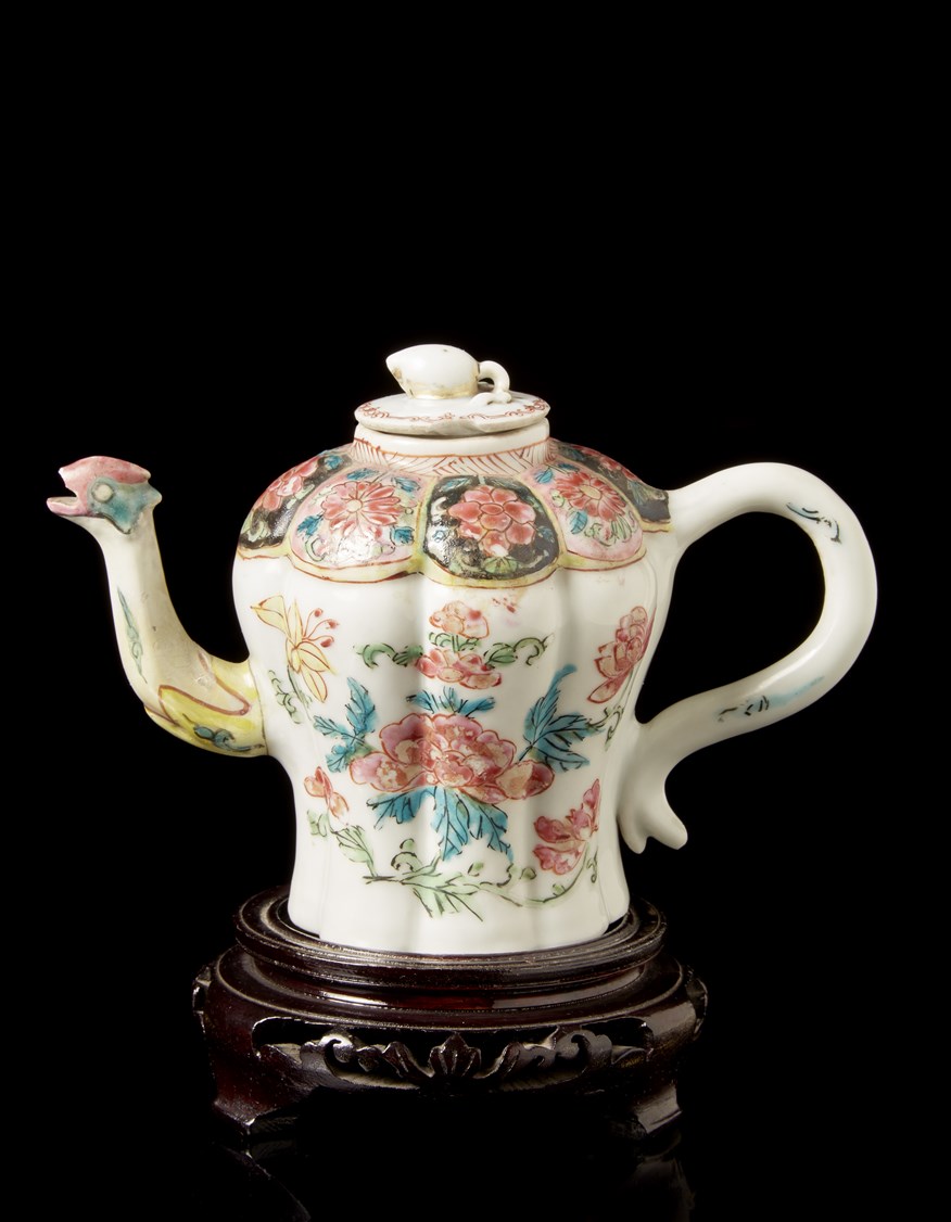 A Famille Rose porcelain teapot, wood cover and base (defects and restorations)