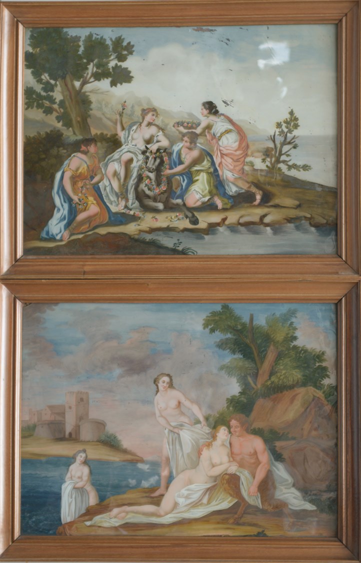 Ignoto, "Venere con un satiro" e "Ratto di Europa" coppia di antichi dipinti su vetro (cm 46x62 circa) in cornici (difetti e mancanze)