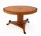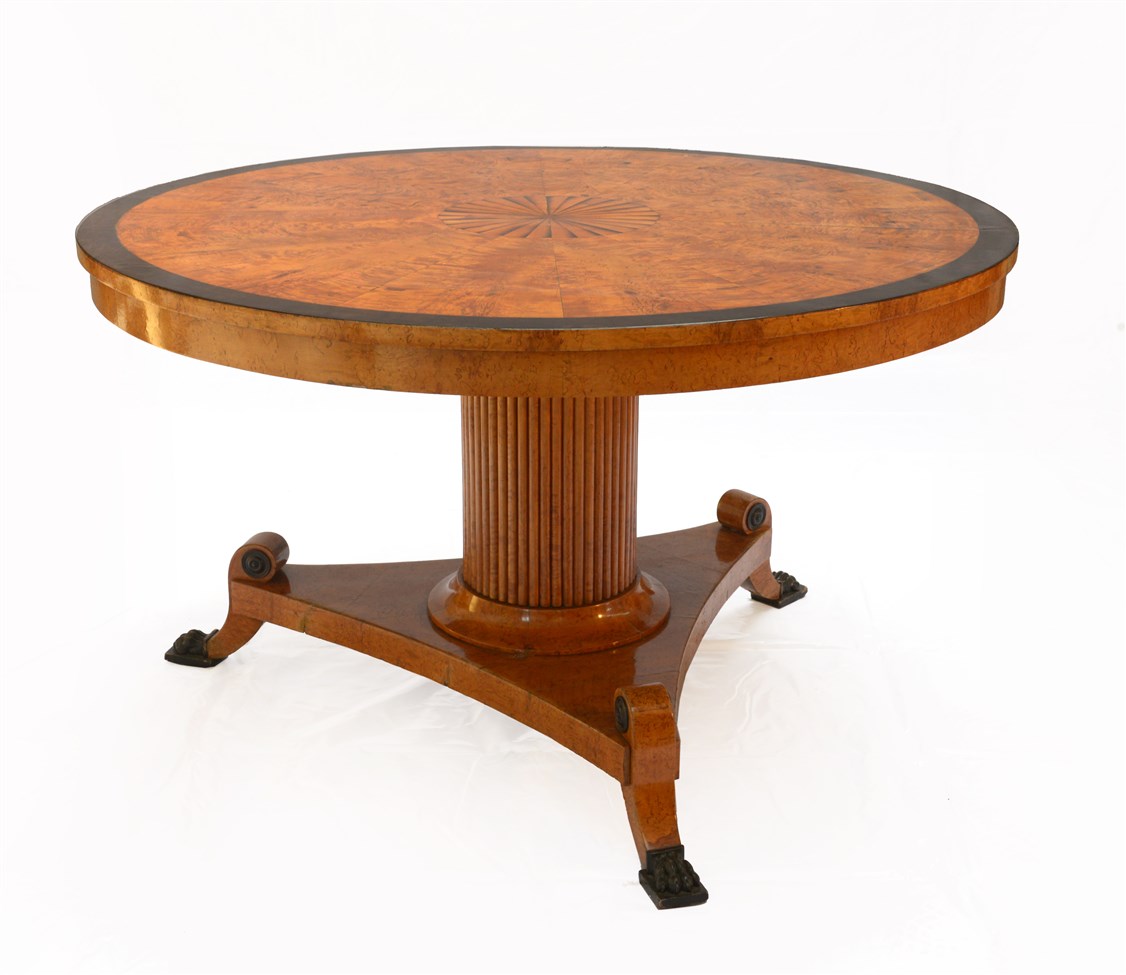 Tavolo con piano tondo lastronato in olmo e centrato da rosone, fascia in palissandro. Sostegno scanalato poggiante su base triangolare. Piedi a zampa ferina. Austria, secolo XIX (d cm 132 x h cm 80) (piano in vetro non coevo) (difetti e restauri)