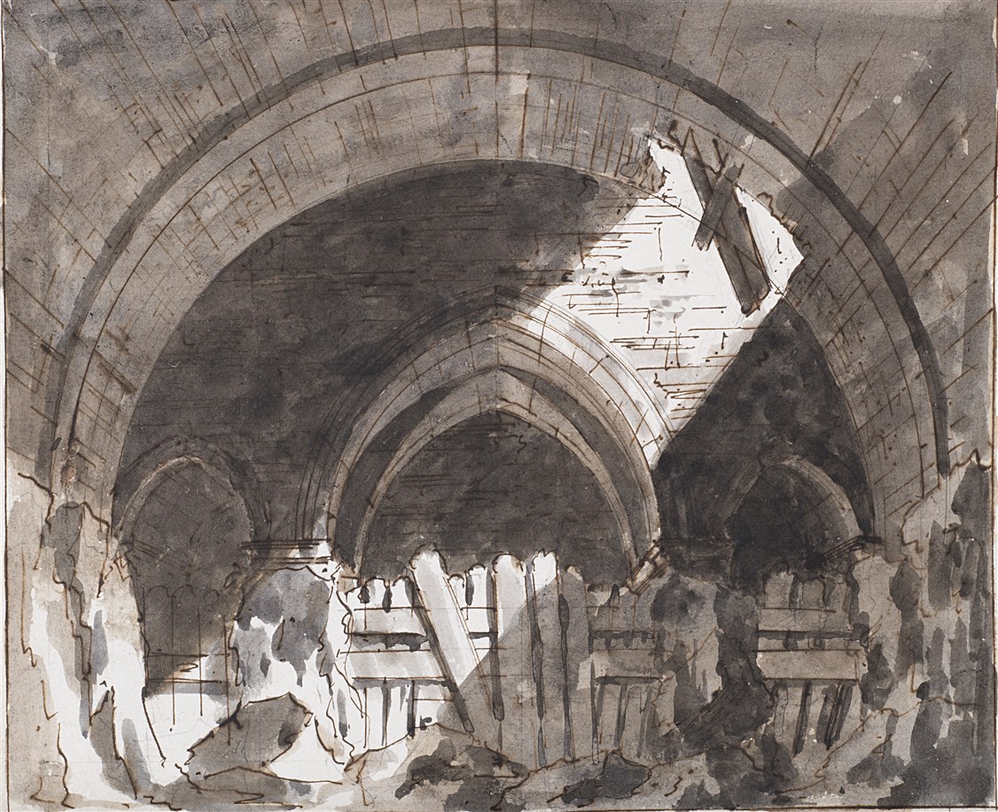 (attributed) "Stage set design: Ruin of a basement" pen and brown ink washed brown over traces of black chalk (mm 230x275) framed
