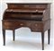 Ribalta a rullo con fronte a otto cassetti di cui tre in linea sottopiano ed anta scorrevole celante vani, cassettini e piano in pelle, gambe rastremate scolpite a piedi ferini, piano in marmo. Secolo XIX (cm 133x126x68) (difetti)