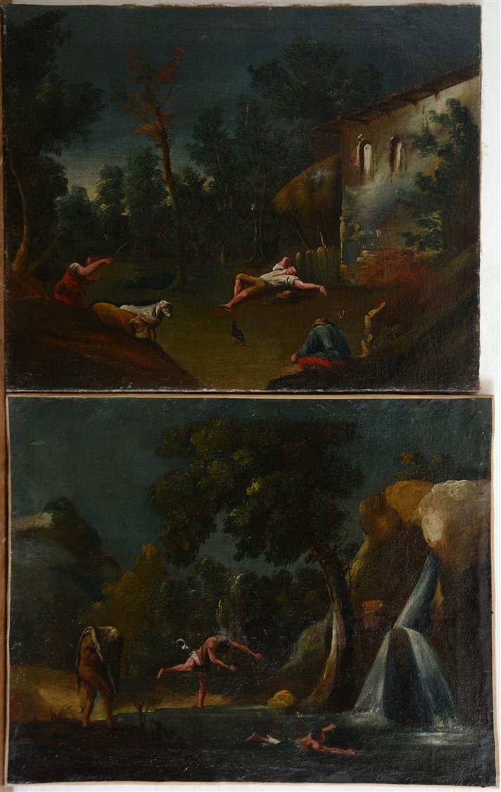 Scuola della fine del secolo XVIII, coppia di dipinti ad olio su tela raffiguranti "Paesaggio con pastori" e "Paesaggio con cascata e bagnanti" (cm 59,5x73,5) (difetti e restauri)