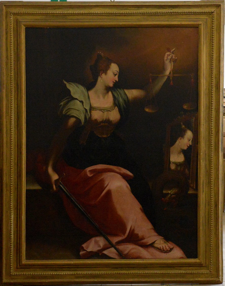 Scuola italiana della fine del secolo XVII - inizi XVIII "Giustizia" olio su tela (cm 112x150) in cornice antica (difetti e restauri)