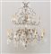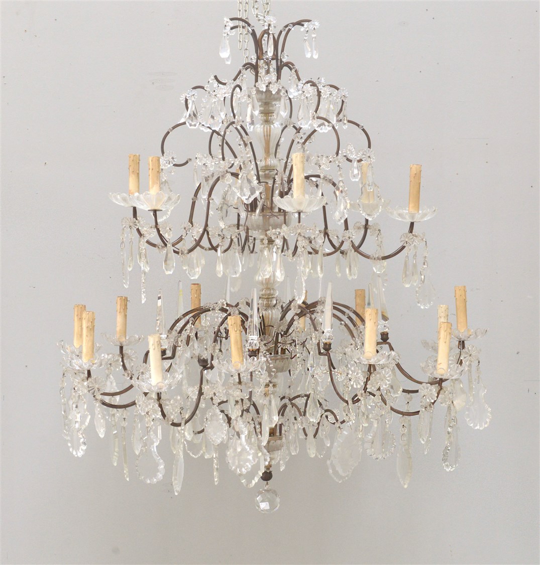 Lampadario a cesto con struttura in metallo a 18 luci disposte su due livelli, decorato da pendagli e gocce in vetro cristallo (h. cm 130)
