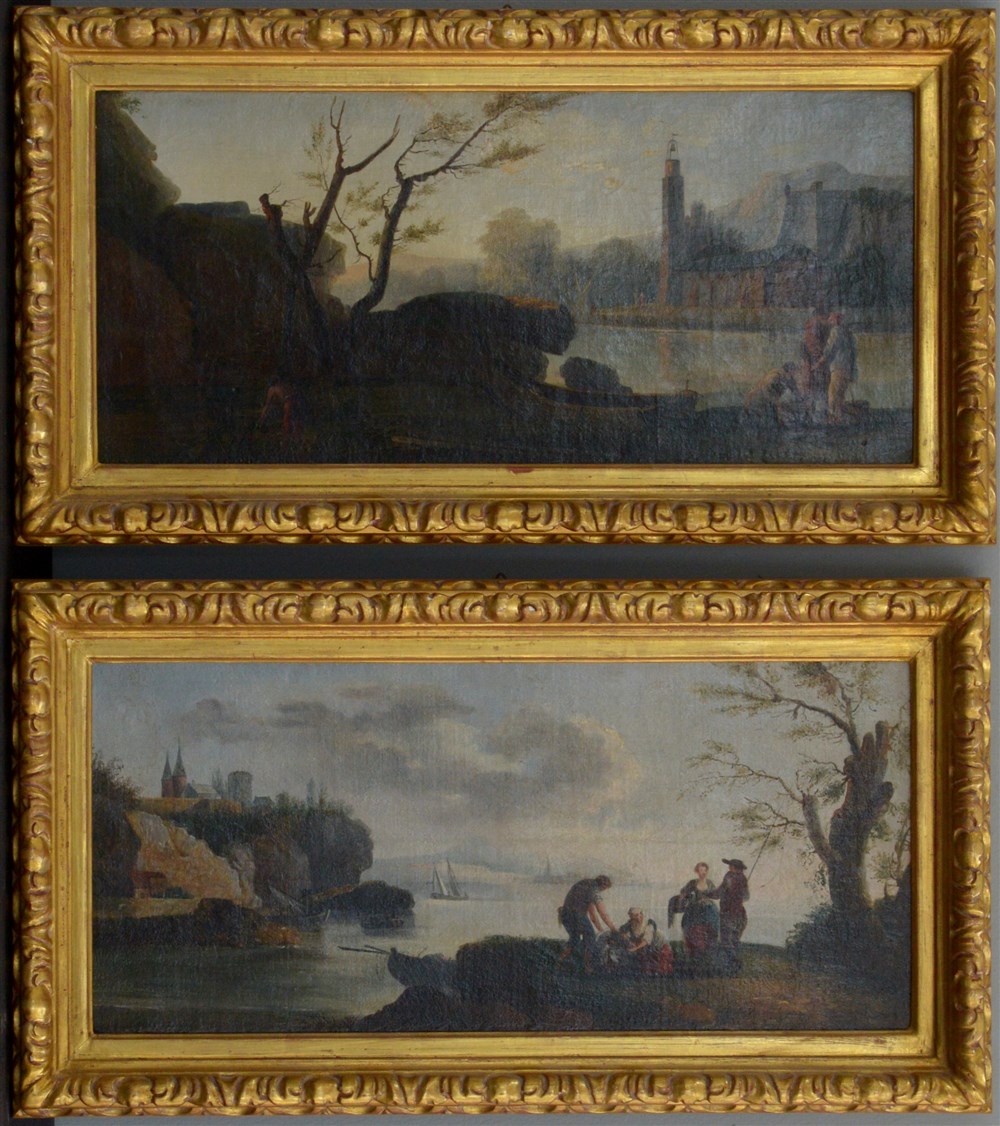 Scuola della fine del secolo XVIII "Paesaggi con figure" coppia di dipinti ad olio su tela (cm 23,5x51)