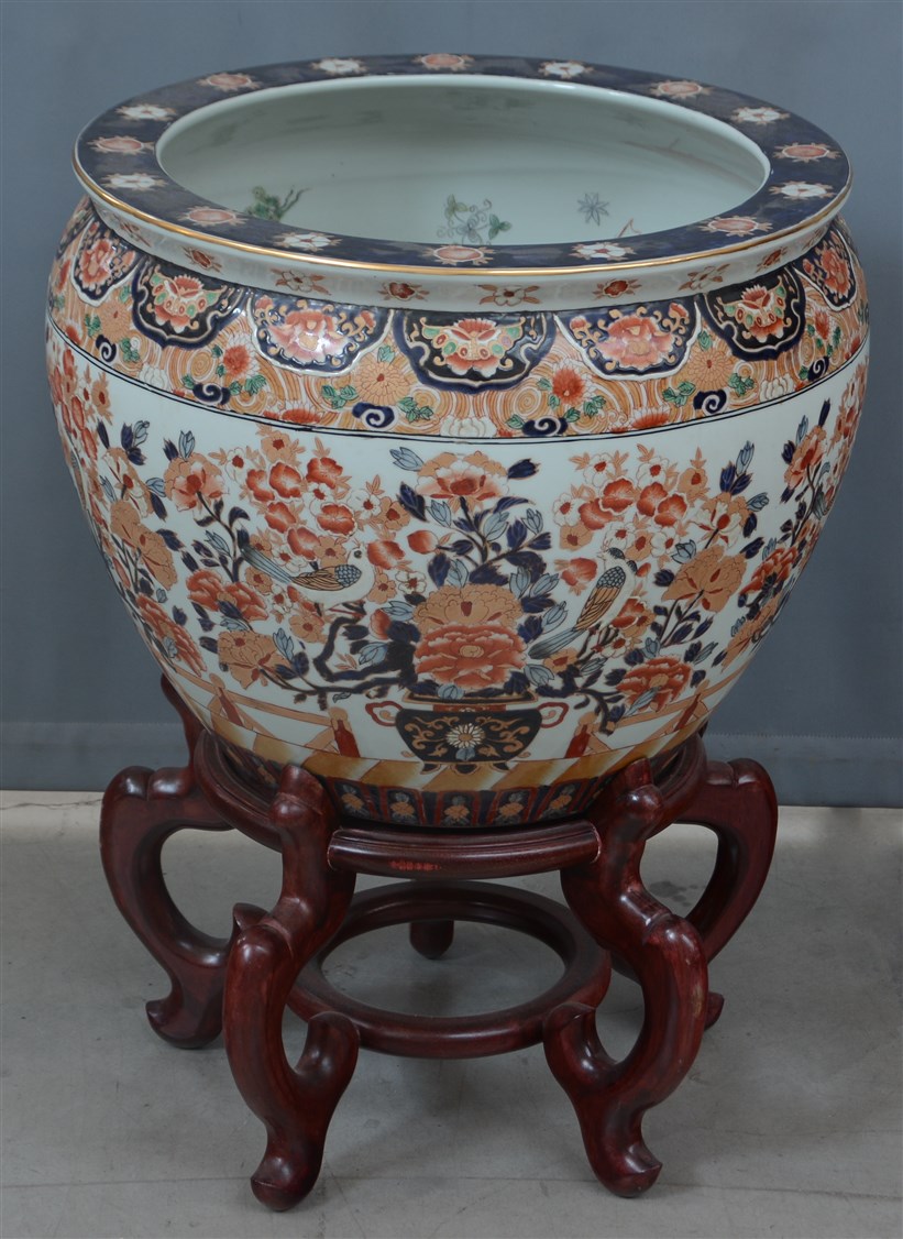 Grande vasca per pesci in porcellana Imari decorata a motivi floreali su fondo bianco, base in legno (d. cm 47) (lievi difetti)