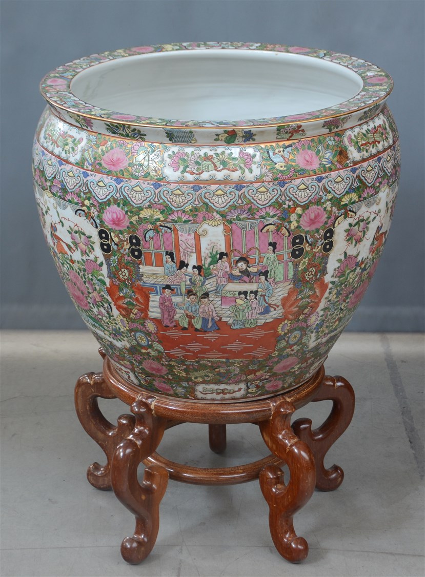 Vasca per pesci in porcellana Famiglia Rosa Cantonese decorata con figure e motivi floreali, base in legno (d. cm 52) (lievi difetti)