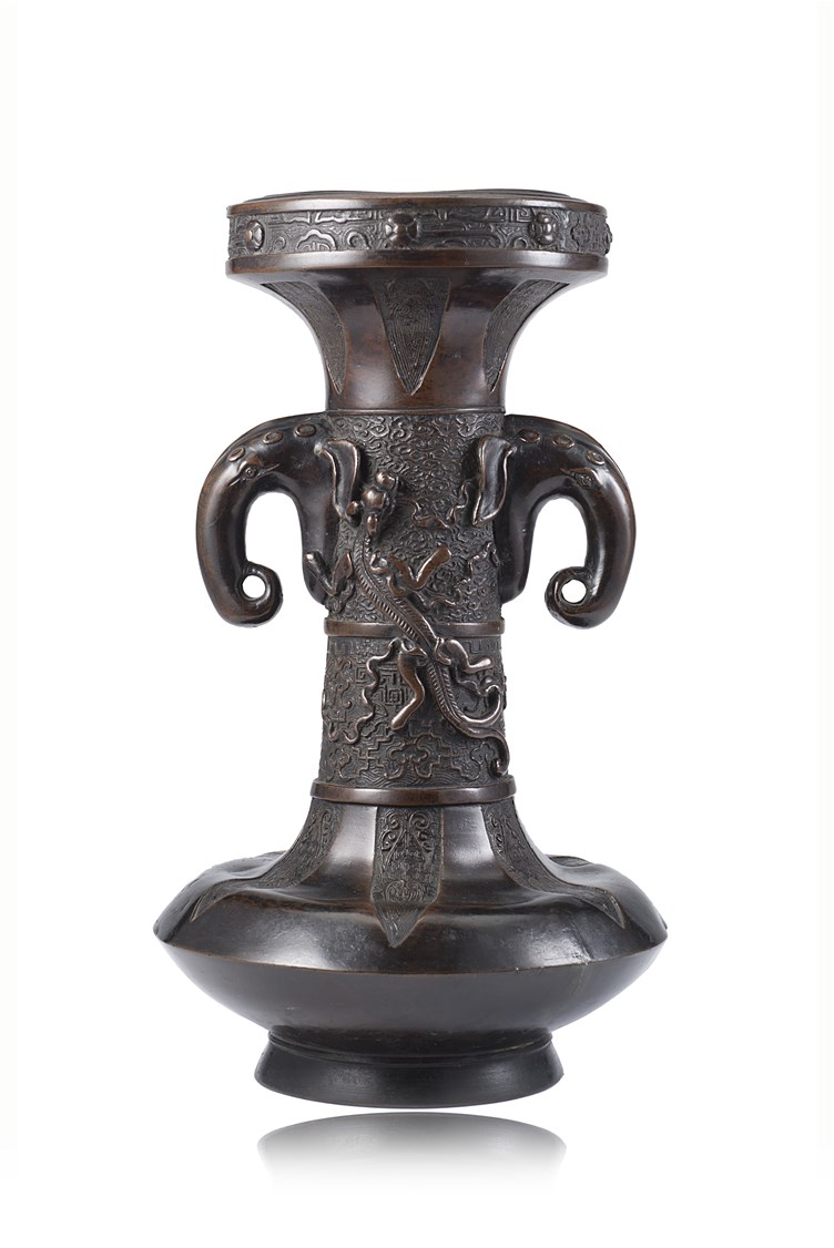 A bronze vase of archaistic form with twin elephant handles and a chilong applied to the neck (defects)