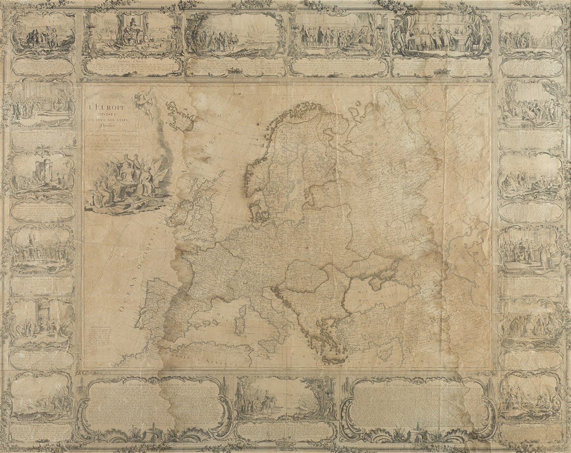 "L'Europe divisée en tous ses etats" etching printed on more sheets depicting Europe surrounded by episodes of the history of the European continent, Paris, 1754 (119x148 cm. circa). Framed (defects and restorations)