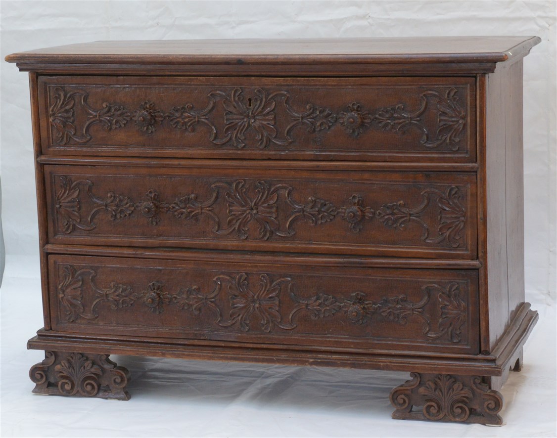 Comò in noce a tre cassetti intagliati a motivi vegetali, piedi a mensola. Secolo XVIII (cm 135x95x62) (difetti e restauri)