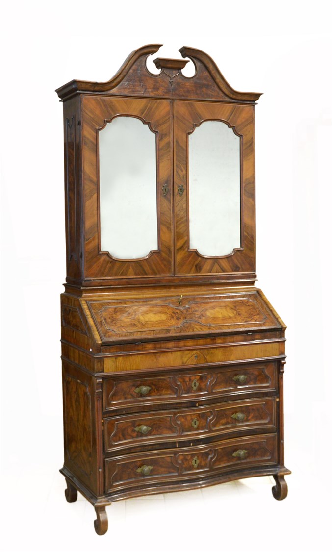 Trumeau lastronato in noce, parte inferiore a tre cassetti, anta ribaltabile e fianchi decorati da specchiature in radica e piuma di noce riquadrate da sagomette, scarabattolo a sei cassettini. Parte superiore a due ante a specchio, cimasa sagomata, piedini a ricciolo, Lombardia secolo XVIII (cm 100x288x53) (difetti e restauri)
