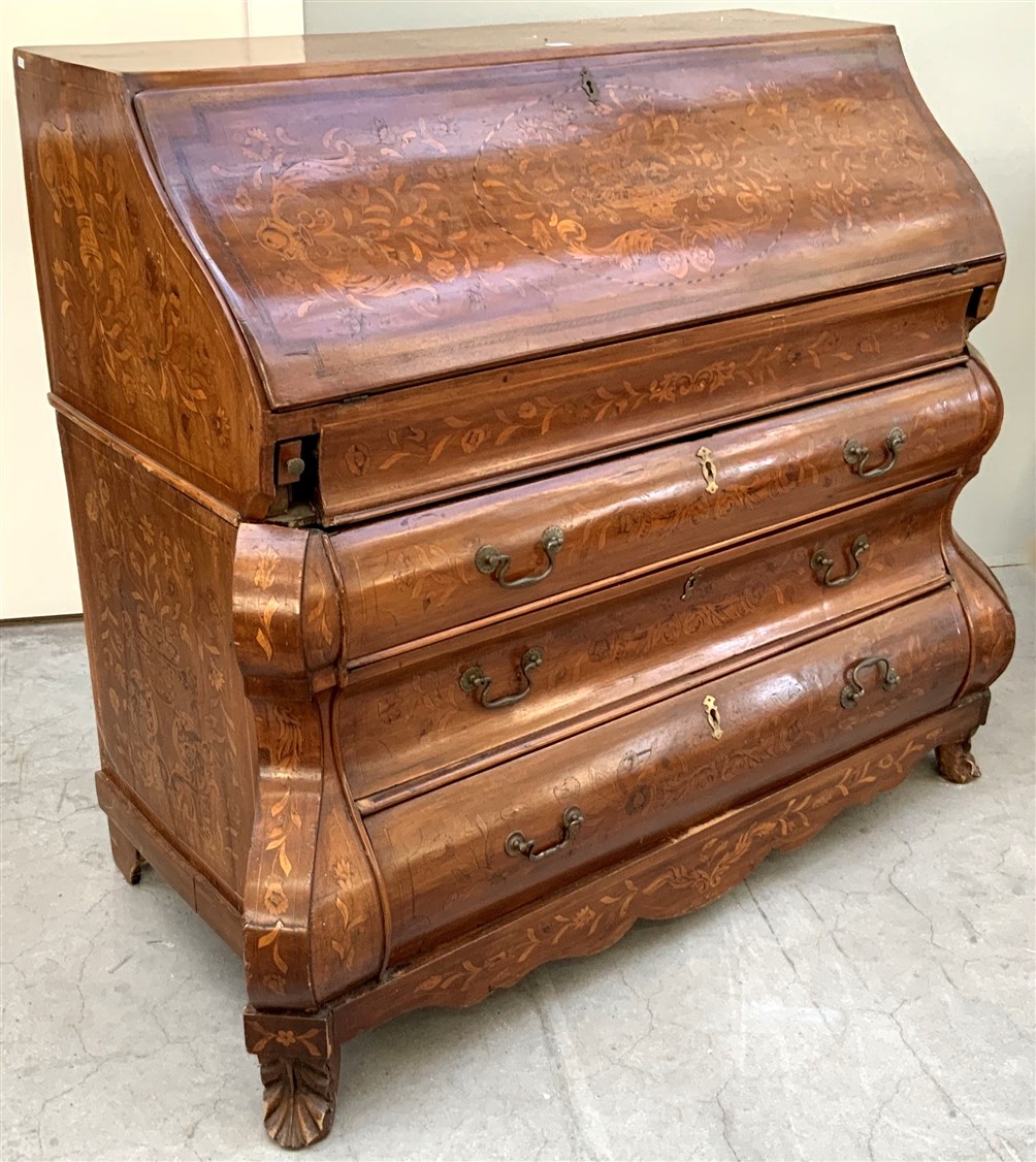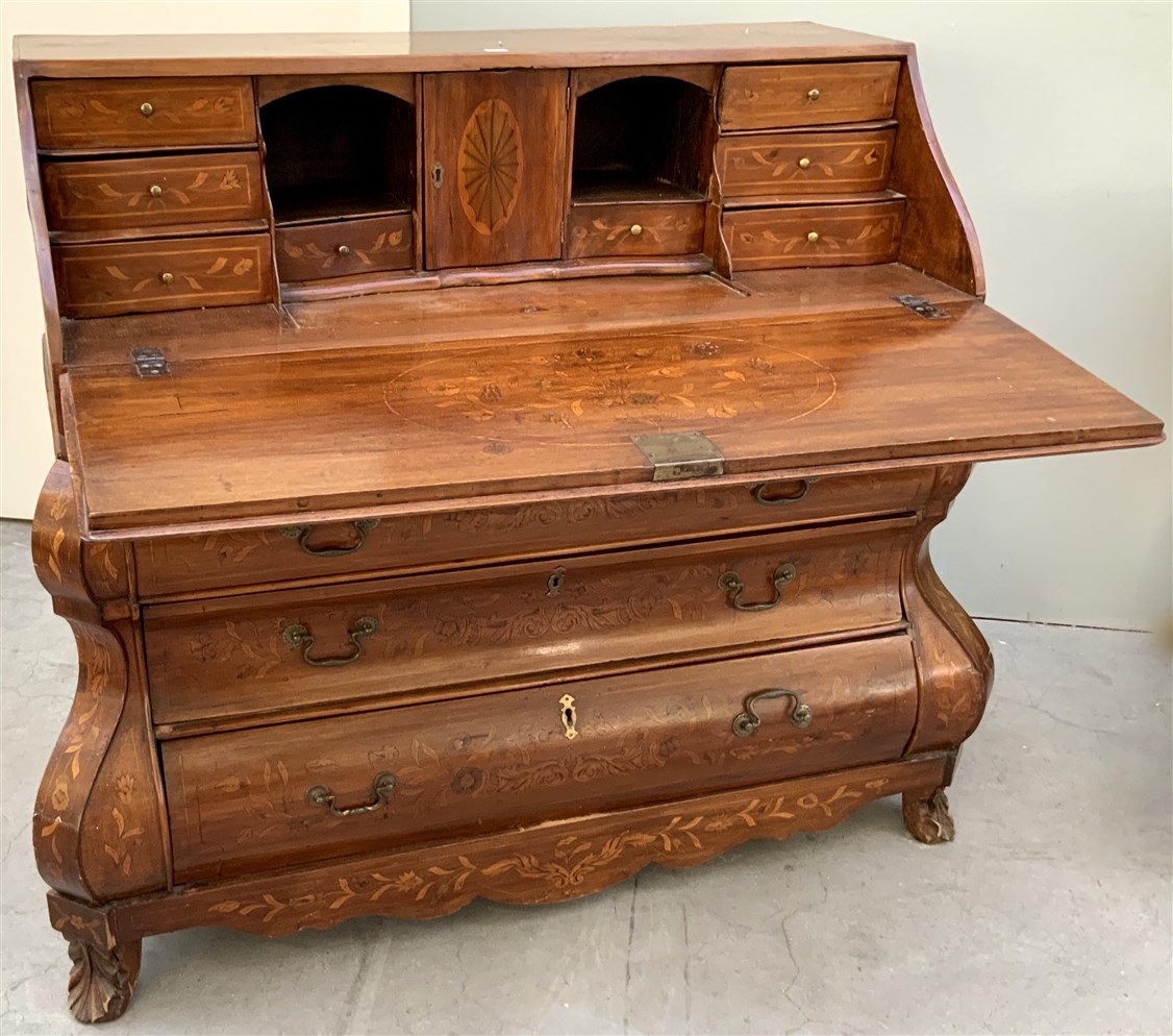 Ribalta interamente filettata e intarsiata a vasi fioriti, motivi vegetali e fiori. Tre cassetti e anta celante otto cassettini, sportello e vano, Olanda inizio secolo XIX (cm 114x108x60) (difetti, restauri e mancanze)