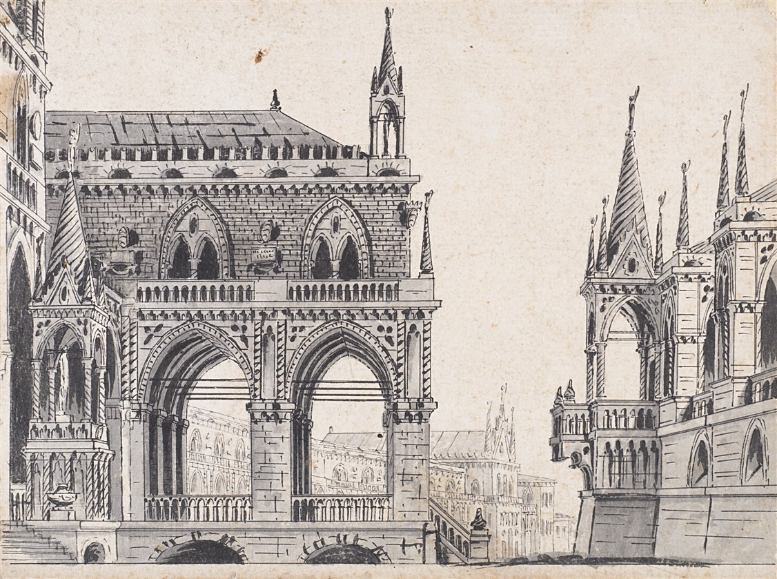 Scenografo della fine del secolo XVIII "Architetture neogotiche prospicienti" penna e inchiostro nero acquerellato in nero e grigio, tracce a matita nera (mm 204x271) In cornice (lievi difetti)