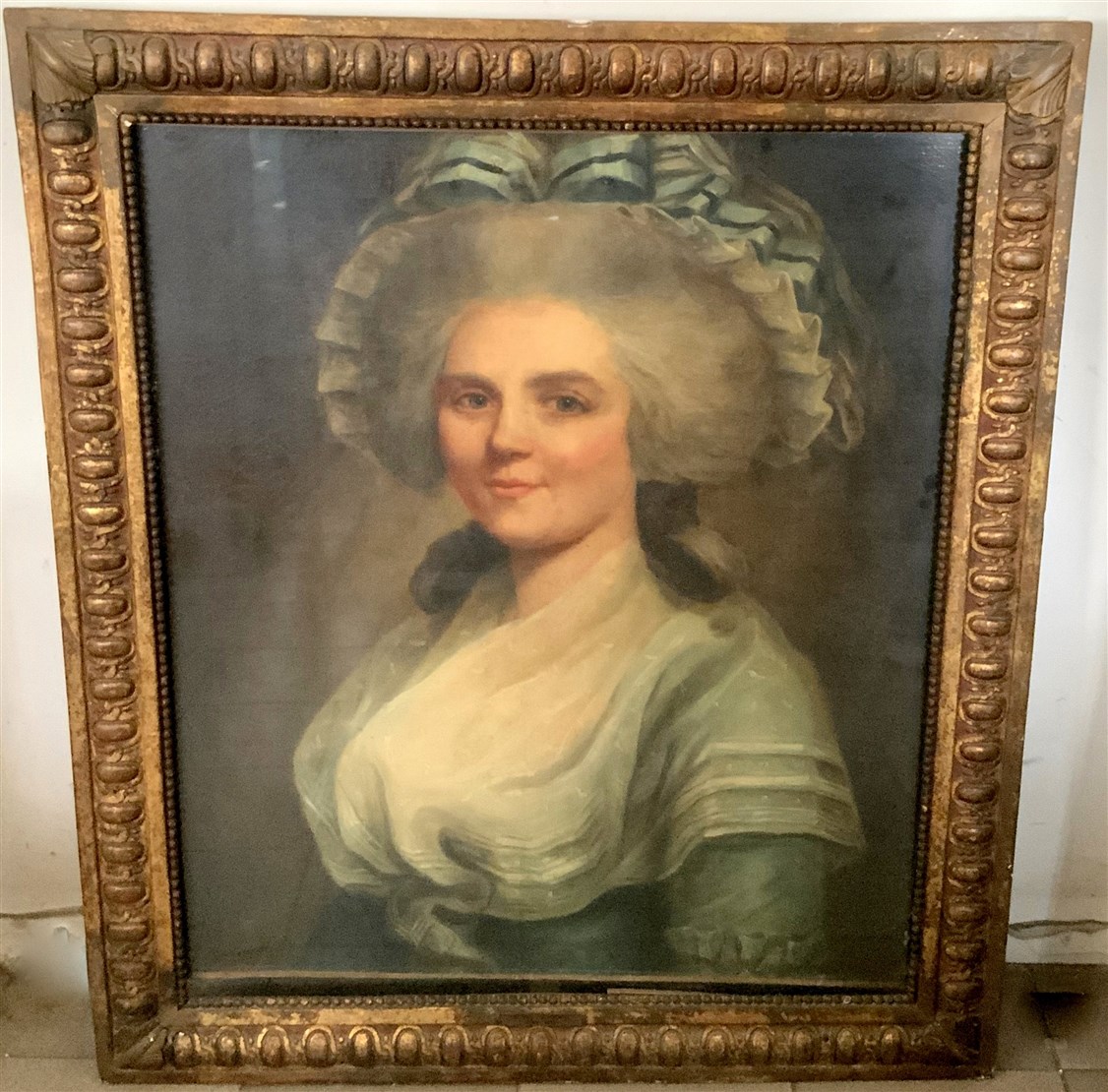 Scuola francese "Ritratto di dama in abito azzurro" olio su tela (cm 64x54) in cornice in legno intagliato e dorato (restauri)