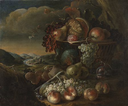 Scuola francese del secolo XVIII "Natura morta di frutta con paesaggio sullo...