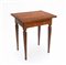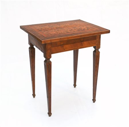 Tavolino da salotto lastronato in noce e radica, filettato in legni chiari, gambe rastremate e scanalate. Secolo XVIII (cm 66x77x52) (difetti e restauri)