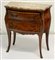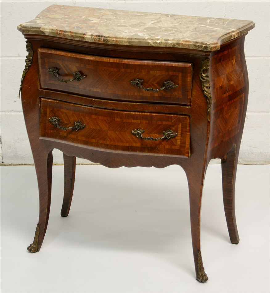 Comodino a fronte mosso a due cassetti, montanti sagomati decorati da fregi. Piano in marmo (cm 64x70x33)(difetti)