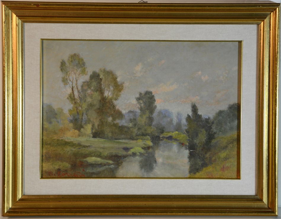 "Paesaggio lacustre" olio su cartone telato (cm 34x49) Firmato in basso a sinistra. In cornice
