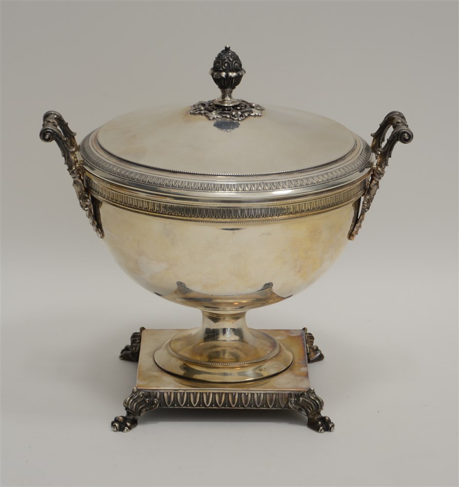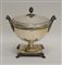 Coppa biansata in argento poggiante su base quadrata sorretta da piedi ferini. Coperchio cimato da presa a guisa di pigna stilizzata. Anse a volute fogliate e bordure decorate a palmette. Titolo 800 (g 1149 ca.) (difetti)