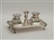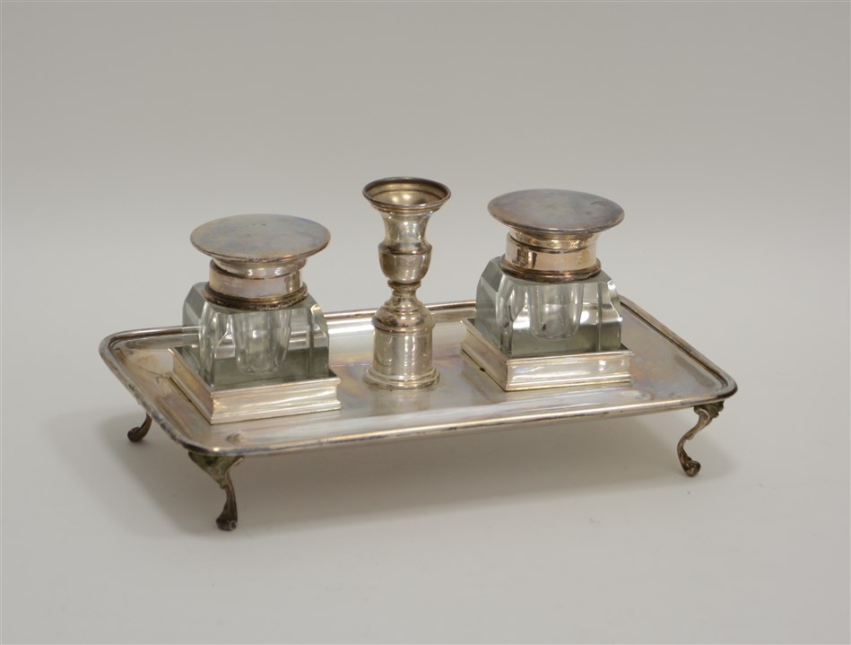 Calamaio in argento liscio con contenitori in vetro. Titolo 800 (g 340 ca.) (difetti)