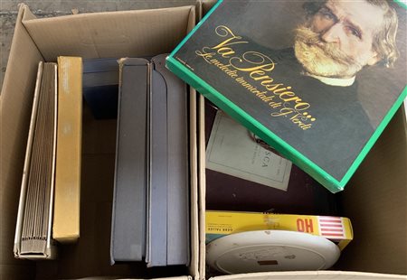 Lotto composto da alcuni dischi di musica classica in vinile, un opuscolo della Tosca, una macchina fotografica "Icon Zeiss", un piatto ginori in porcellana e tre raccolte del settimanale la "Domenica sportiva" degli anni 30, in due cartoni (difetti e mancanze)