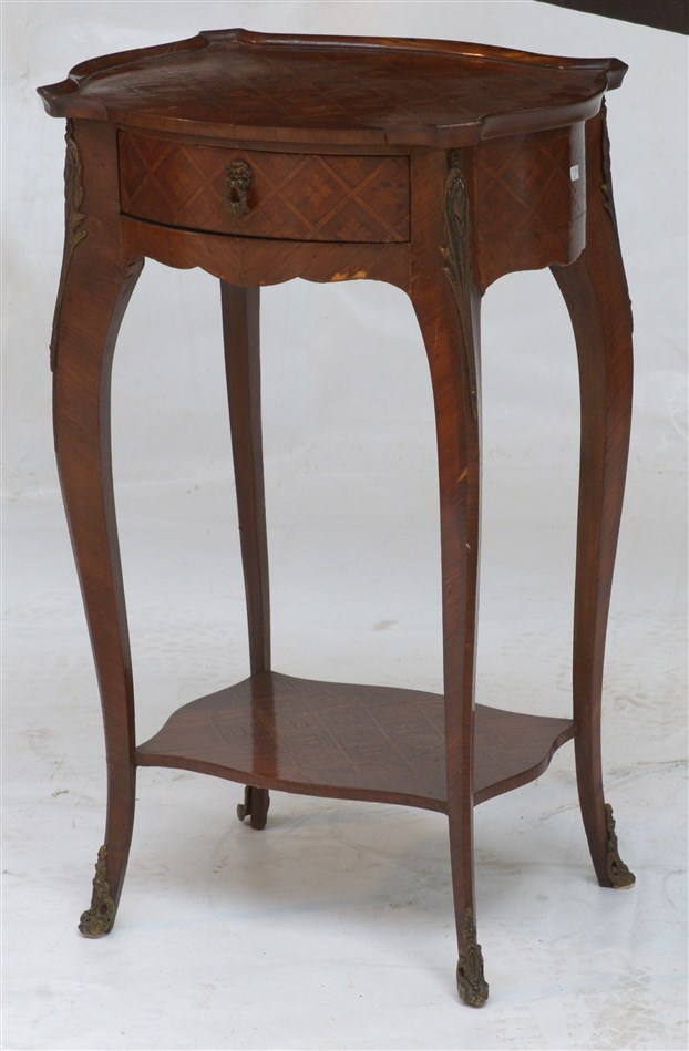 Mobiletto da centro lastronato, filettato e intarsiato a fiori, un cassetto nella fascia, gambe sagomate riunite da pianetto, fregi in metallo (cm 43x68x32) (difetti e mancanze)