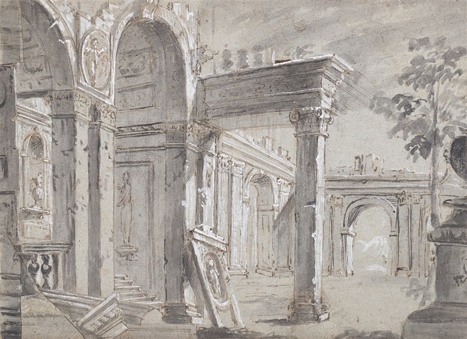Anonymous set designer, late 18th century "Classic Ruins" pen, grey ink washed grey and black, heightened with white over traces in black chalk. On light blue prepared paper (mm 195x265) framed