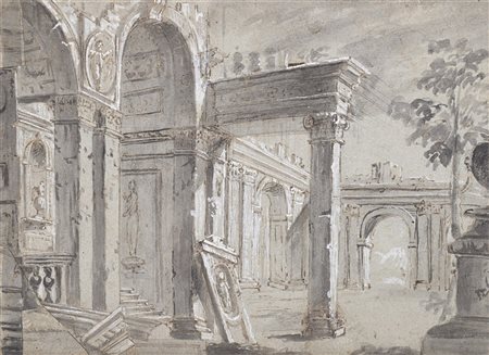 Scenografo della fine del secolo XVIII "Ruderi classici" penna e inchiostro gri
