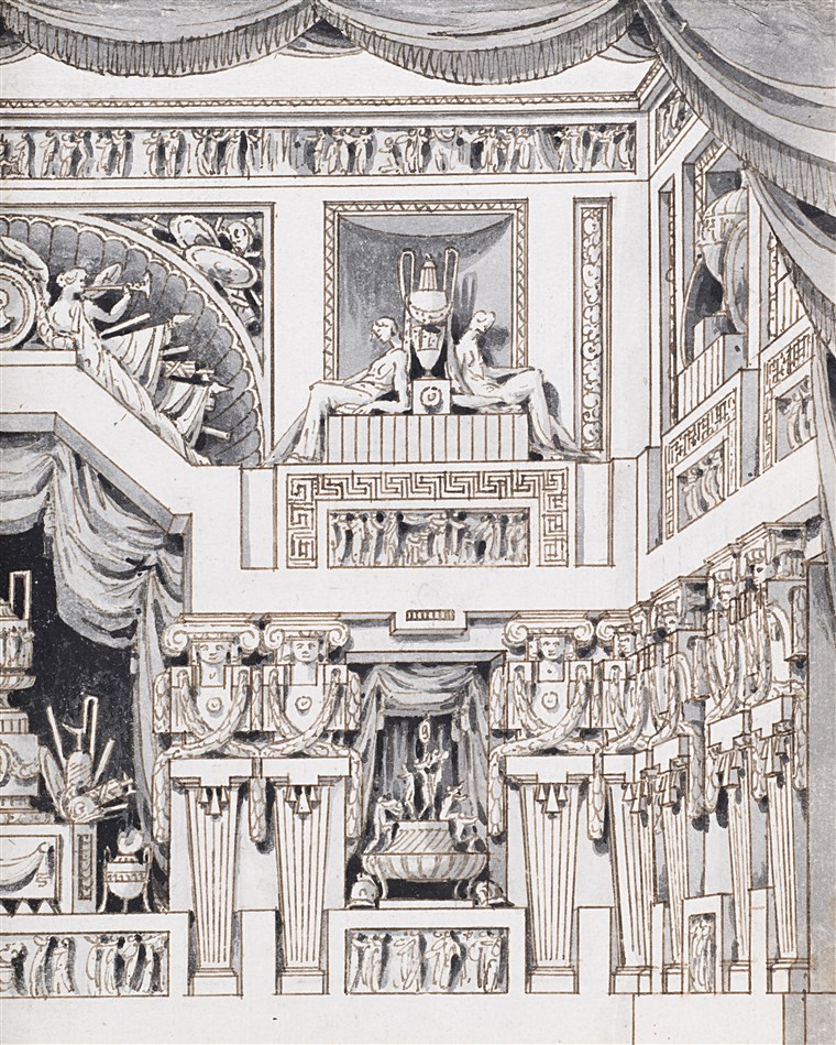 Anonymous stage set designer, 19th century "Room decorated with sculptures, friezes and frescoes" pen and brown ink washed gray (mm 249x198) framed