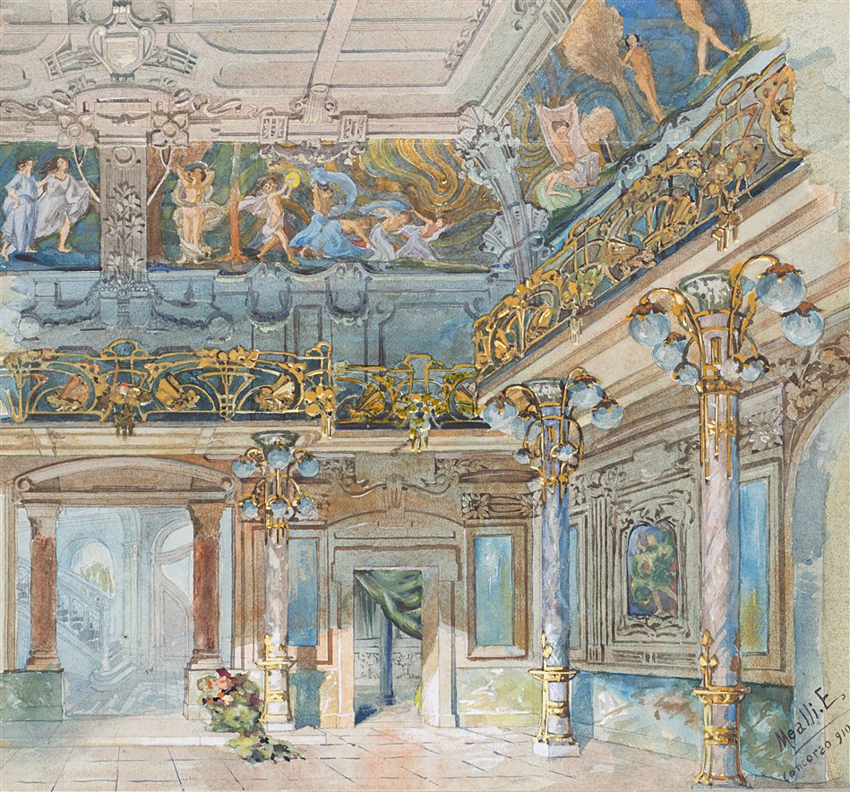 Scenografo dell'inizio del secolo XX "Interno di salone Liberty" acquerelli e tempere (mm 420x460) In cornice. Firmato "Mealli E. / Conconi 910" (difetti)