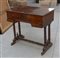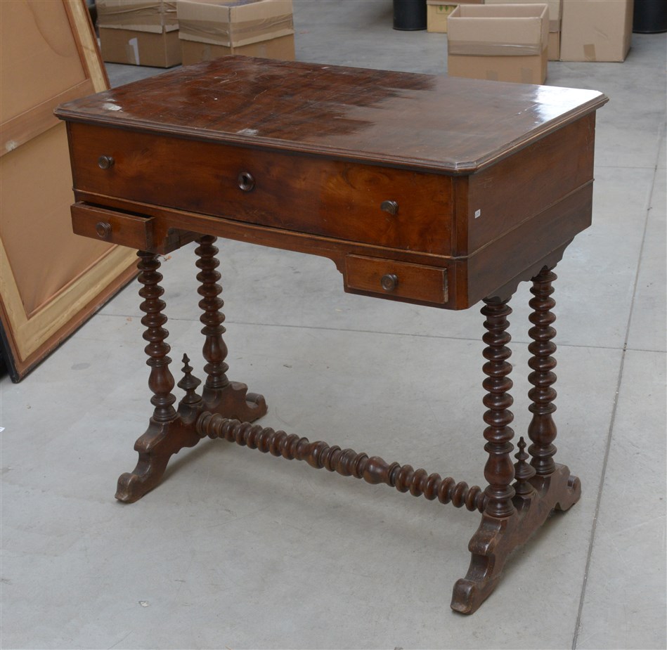Piccolo scrittoio con tre cassetti, gambe tornite riunite da traversa, secolo X