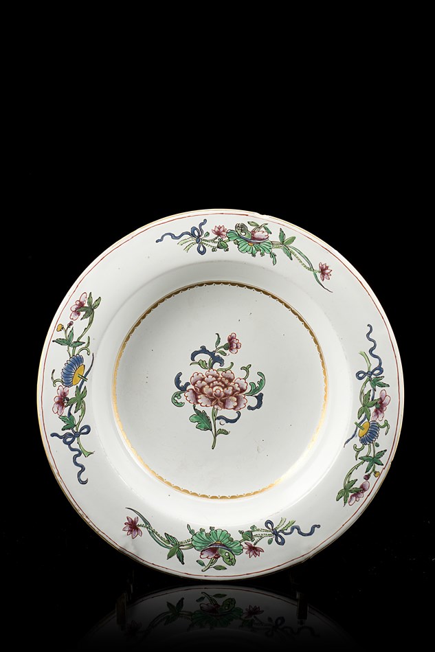 Manifattura di Pasquale Rubati, Milano, 1770/80. Piatto tondo e fondo in maiolica, orlo profilato in oro e sul bordo quattro steli recisi con fiori. Cavetto dipinto da una bella peonia all'orientale, incorniciato da una bordura in oro (d. cm 22) (sbeccatura e restauro) Sul retro è presente pennellata in blu/giallo. Per confronto si veda: scheda n. 344 a cura di R. Ausenda in 'Musei e Gallerie di Milano - Museo d'Arti Applicate Ceramiche', Tomo II, Electa 2001