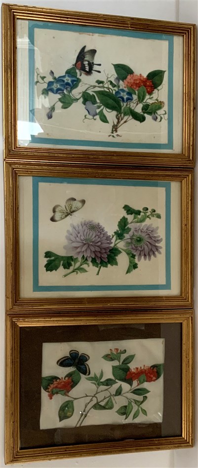 Gruppo di tre dipinti su carta di riso raffiguranti fiori e farfalle (misure diverse) (difetti) In cornici