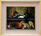 "Composizione con gazza e funghi" olio su faesite (cm 40x50) Firmato in basso a destra. Al retro: etichetta con titolo; timbro. In cornice