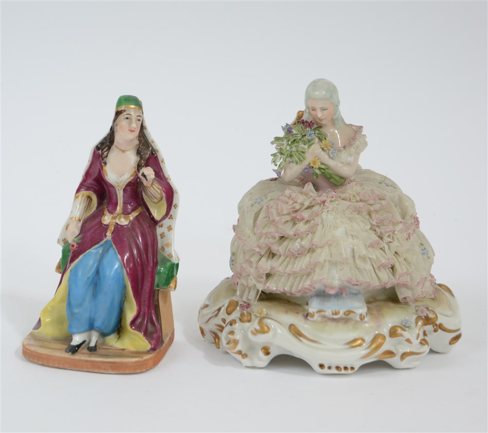 Lotto di due statuine in porcellana raffiugranti dame (h max cm 17) (difetti e mancanze)