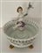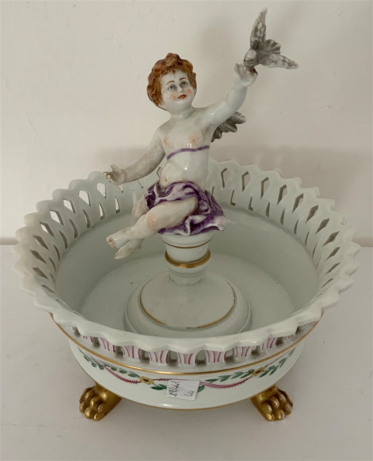 Manifattura del secolo XIX. Centrotavola in porcellana con bordo traforato sormontato da cherubino con colomba, vasca poggiante su piedi leonini dorati (h. cm 25) (difetti)