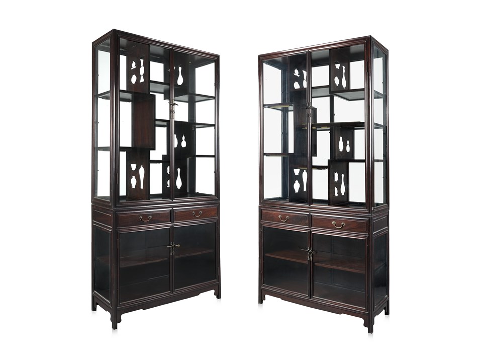 Coppia di vetrinette in legno scuro con parte inferiore con cassetti a due battenti con divisori interni sagomati