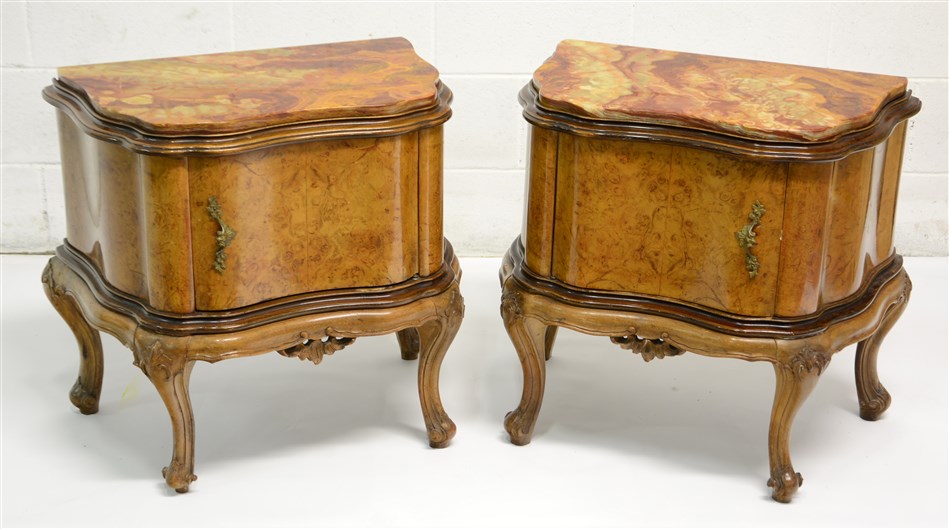 Lotto composto da due comodini con fronte mossa ad un'anta, piano in alabastro e gambe sagomate (cm 54x81x40) (difetti e restauri)