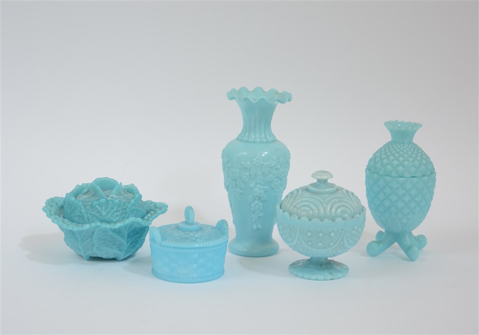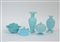 Lotto composto da un vasetto e quattro contenitori con coperchio in opaline celeste di forme differenti (h max cm 22) (lievi difetti)