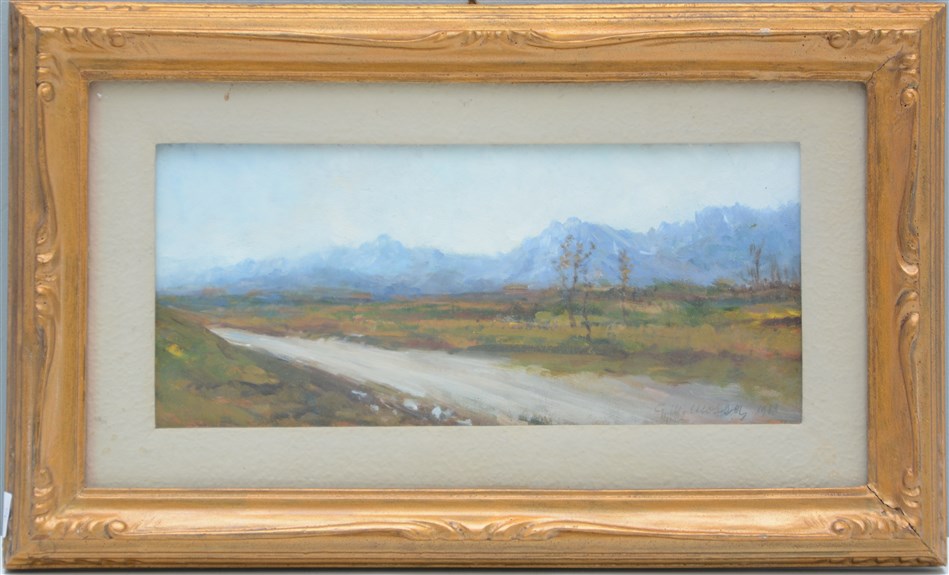 "Verso la sera" Erba 1968, olio su compensato (cm Firmato e datato in basso a destra. Al retro sulla carta di chiusura firmato, datato, locato e titolato. In cornice