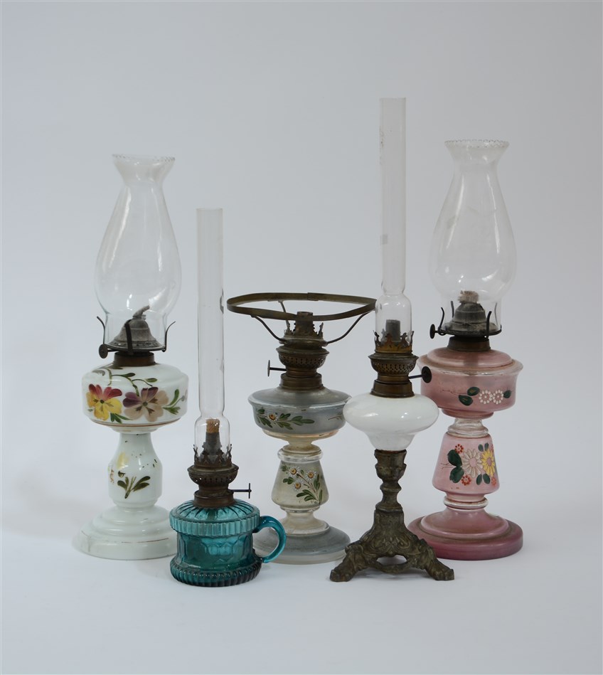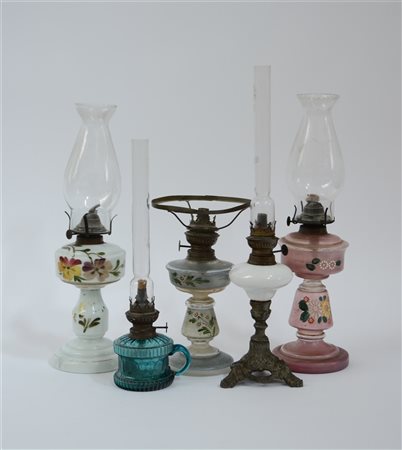 Lotto di cinque lampade a petrolio di fatture e materiali differenti (difetti e mancanze)