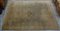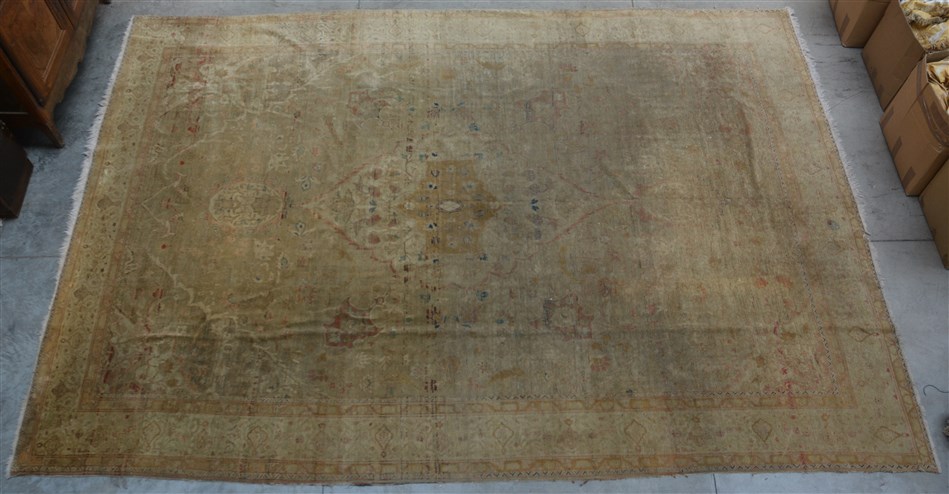 Importante decoro con medaglione a puntali imperiali nei toni del verde acqua marina, salmone, giallo e blu su campo color sabbia. Bordura Herati (cm 394x275) (gravi difetti)
