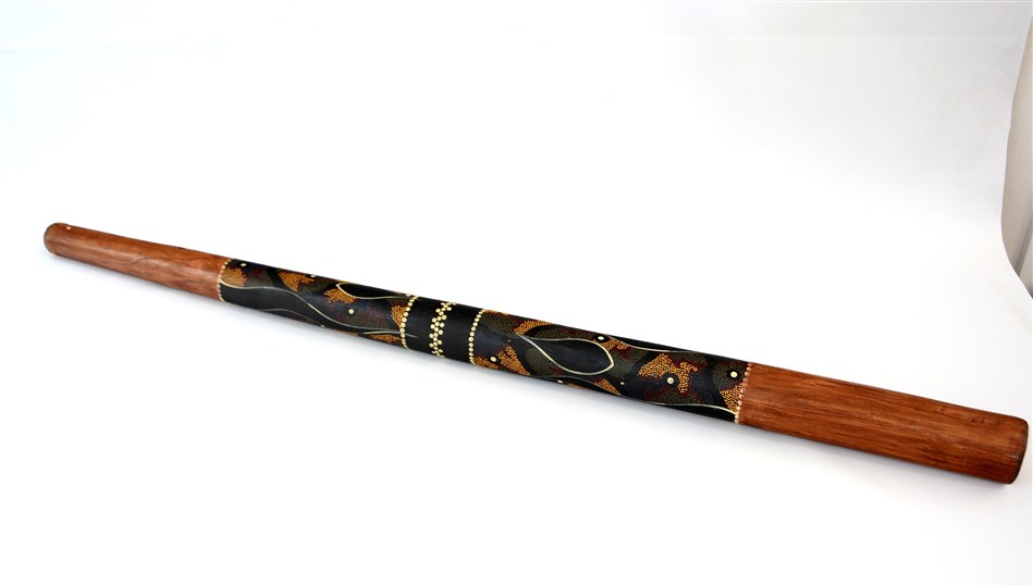 Strumento a fiato di origine aborigena, tipico dell’Australia settentrionale, costruito con un ramo di eucalipto, con l’interno scavato dalle termiti e rifinito poi a mano, la parte centrale esterna è dipinta con decorazioni tradizionali che richiamano la mitologia aborigena (lievi difetti)
