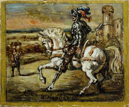 Giorgio de Chirico (Volos, 1888 - Roma, 1978) Cavallo e Cavaliere, metà anni '50 olio su cartone telato, cm. 19,5x23,5 Firma in basso al centro; dipinto al verso con studi di figure. Opera Archiviata presso la Fondazione De Chirico , perizia n° 138 del 1994 (12 marzo)