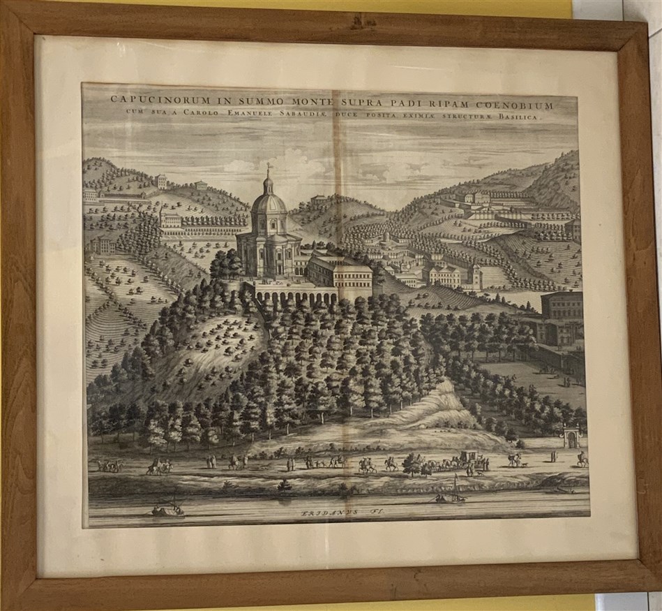 Anonimo del secolo XVIII, Torino : "Capucinorum in summo monte supra padi ripam coenobium" Incisione tratta da Theatrum Sabaudiae (battuta cm 51x60 circa) (difetti)
