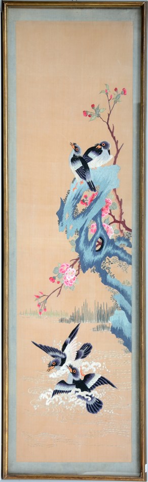 Ricamo, Cina secolo XX, in seta su seta raffigurante una roccia con rami di pesco sopra un lago con quattro uccelli (cm 132x35) In corcnice in legno dorato (lievi difetti)