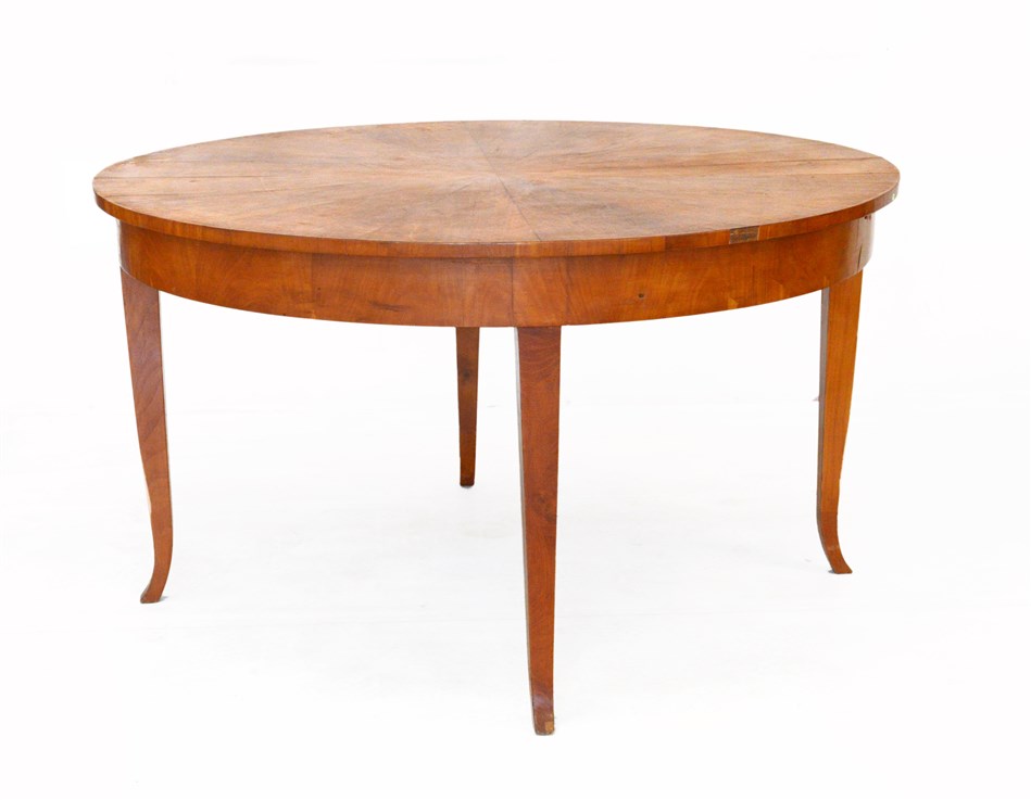 Tavolo con piano tondo latronato in noce, gambe a sciabola, fine secolo XIX (d cm 138x h cm 77) (difetti e restauri)